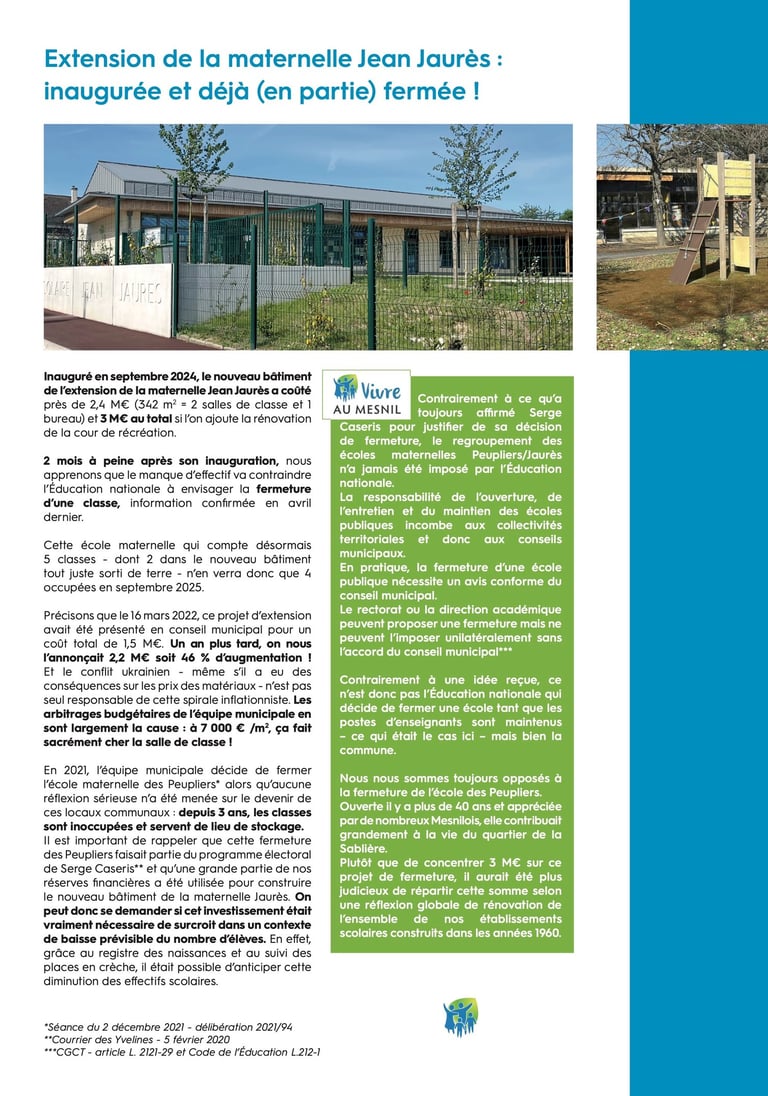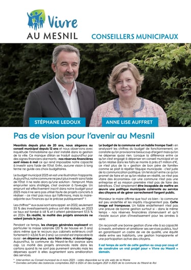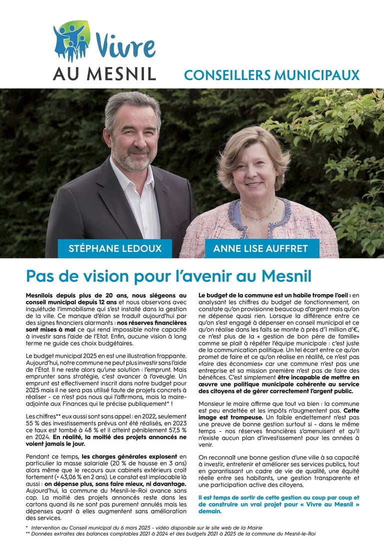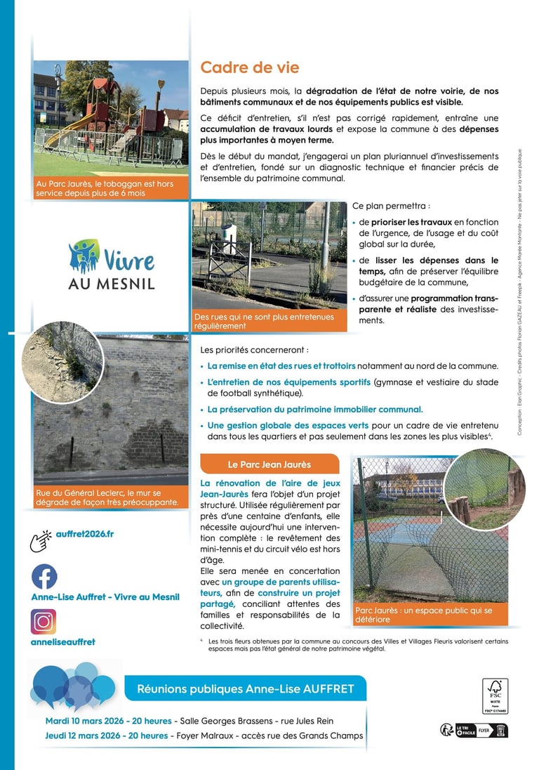 Avec une équipe de Mesnilois engagés et investis à mes côtés, animés par la même volonté d’écoute et de proximité, nous avons construit un programme réaliste et responsable, attentif à la bonne gestion des finances publiques et aux priorités du quotidien