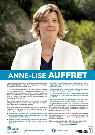 Mesniloise depuis plus de 20 ans et élue municipale depuis 2014, j’ai décidé de me présenter aux prochaines élections municipales des 15 et 22 mars 2026.
